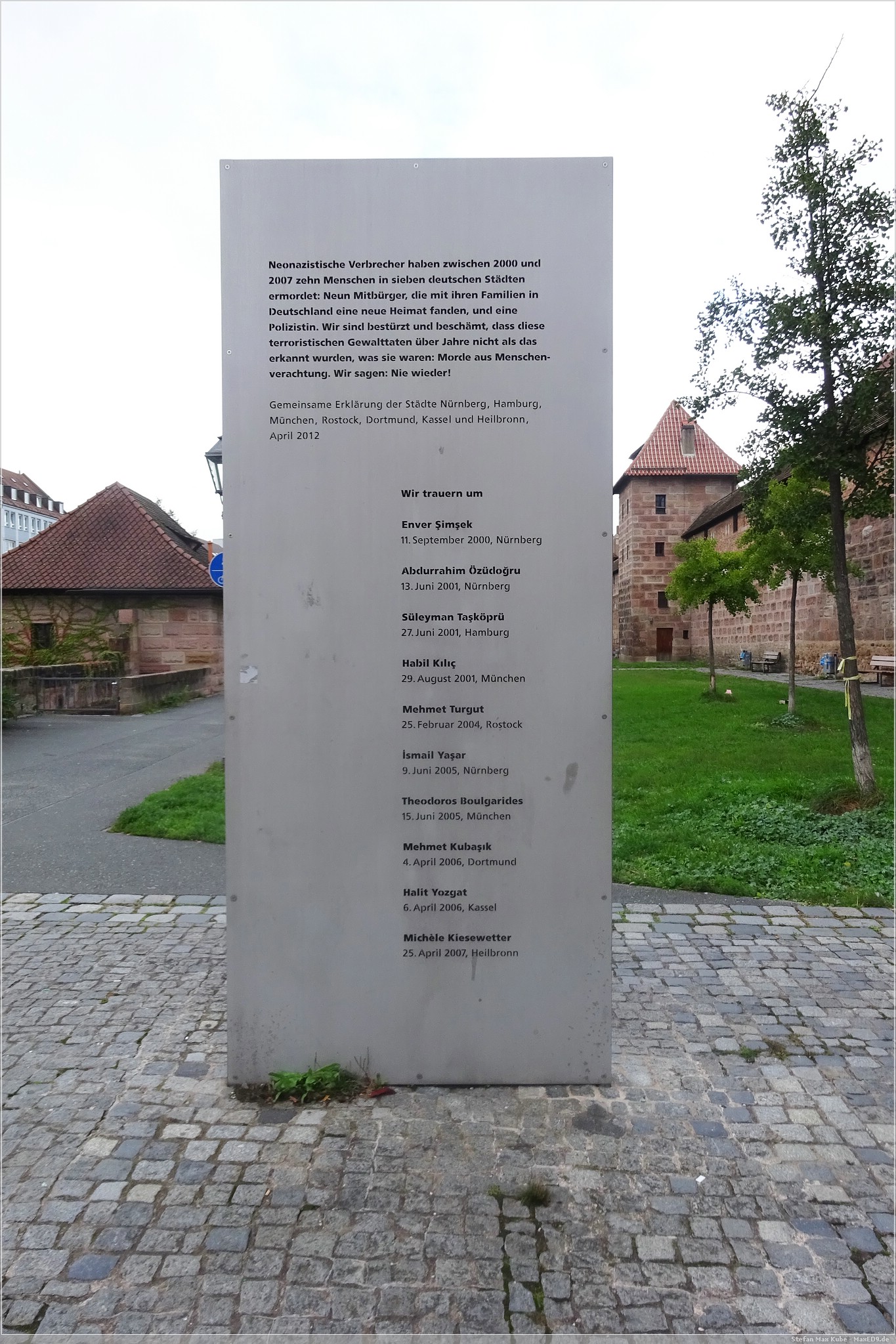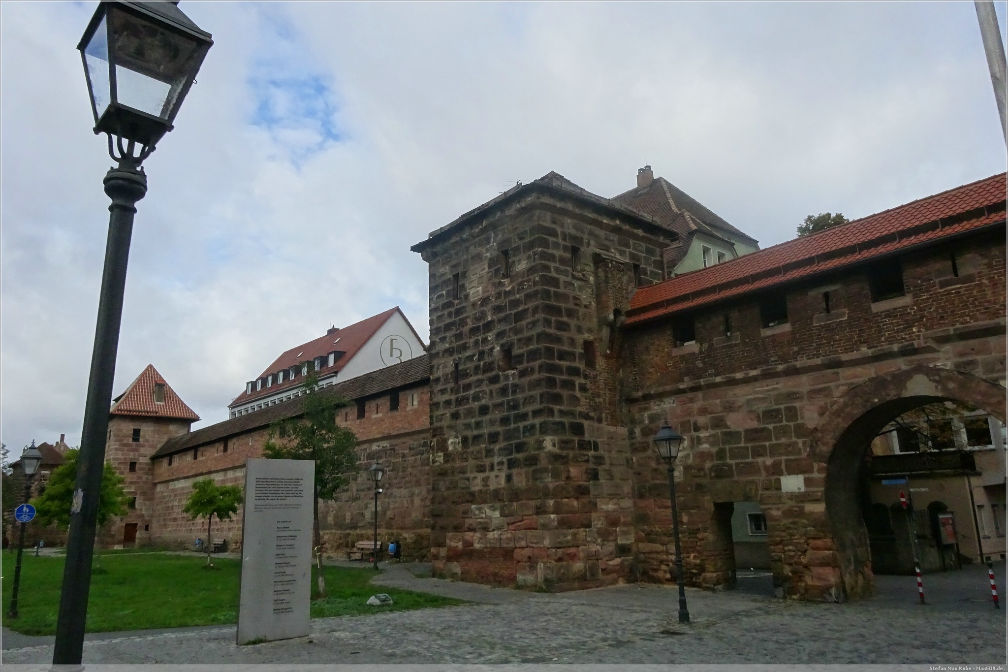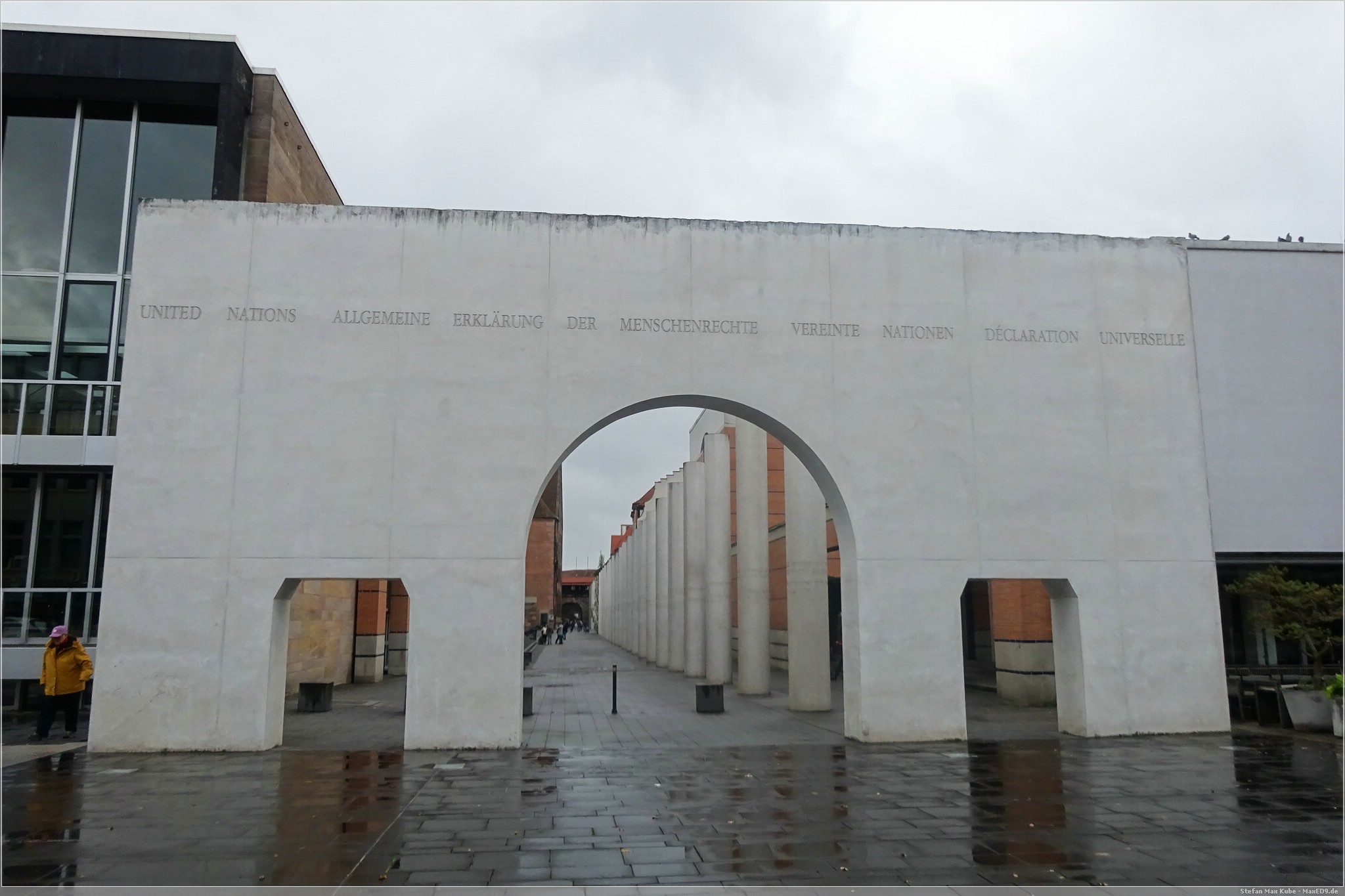 Nachdem Frühstück fuhren wir mit der U-Bahn eine Station bis zur Station Opernhaus, überquerten den Frauentorgraben und befanden uns innerhalb der Stadtmauer direkt in der Straße der Menschenrechte. Diese 1993 eingeweihte imposante Kunstwerk besteht aus 27 Säulen mit 8 m Höhe, 2 Bodenplatten und einem Eingangstor. Darauf finden sich Auszüge aus den 30 Artikeln der Erklärung der Menschenrechte, jeweils in Deutsch und einer anderen Sprache.