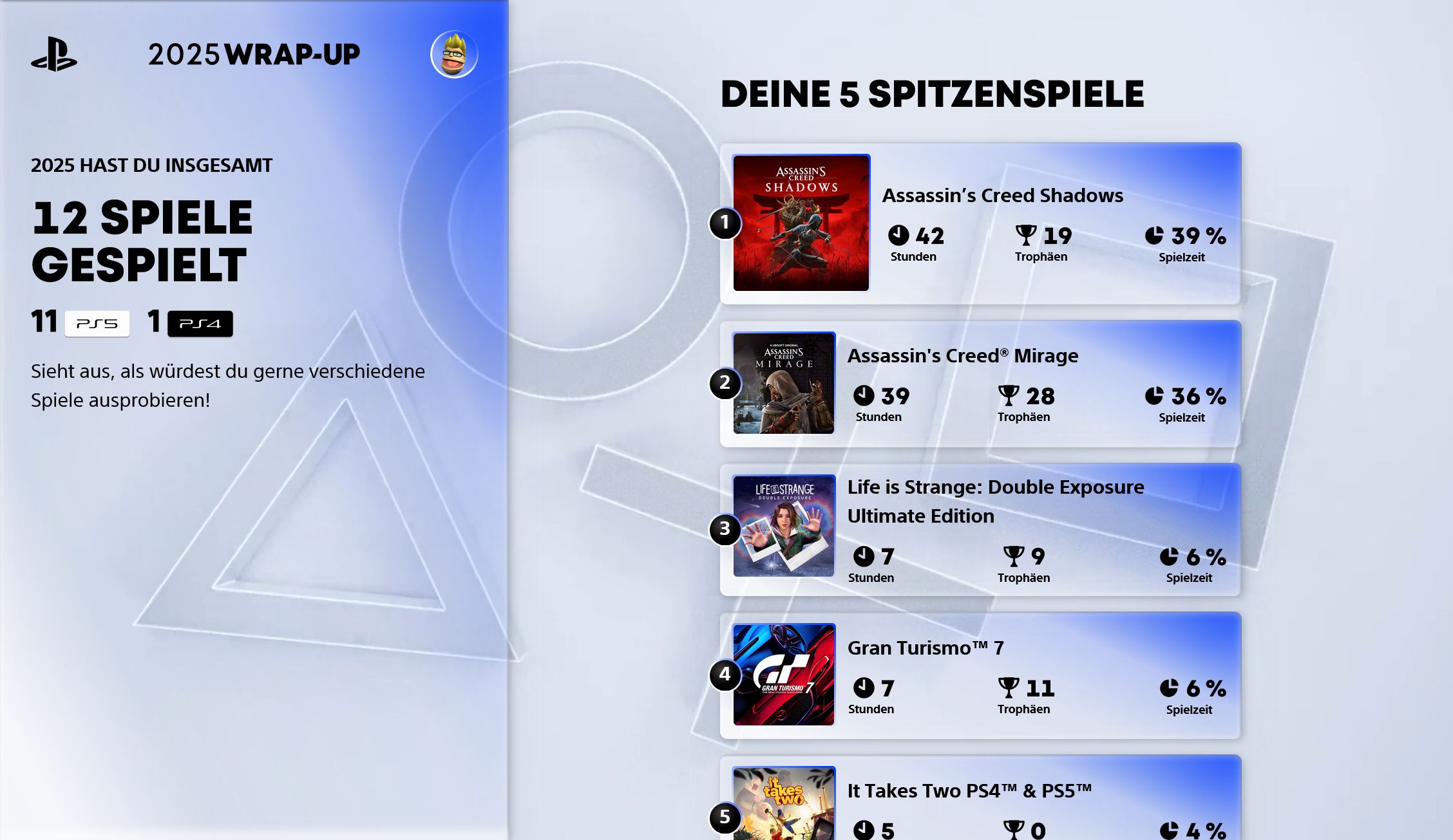 Ich habe doch tatsächlich mehr Stunden an der Konsole verbracht als 2024. Nachdem Assassin’s Creed Mirage ja lange rumlag, habe ich mich dann doch mal drangesetzt und es auch durchgespielt, damit ich dann auch gleich mit Shadows weitermachen konnte.