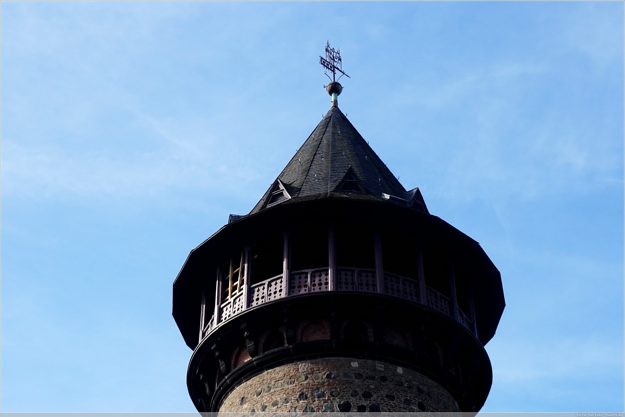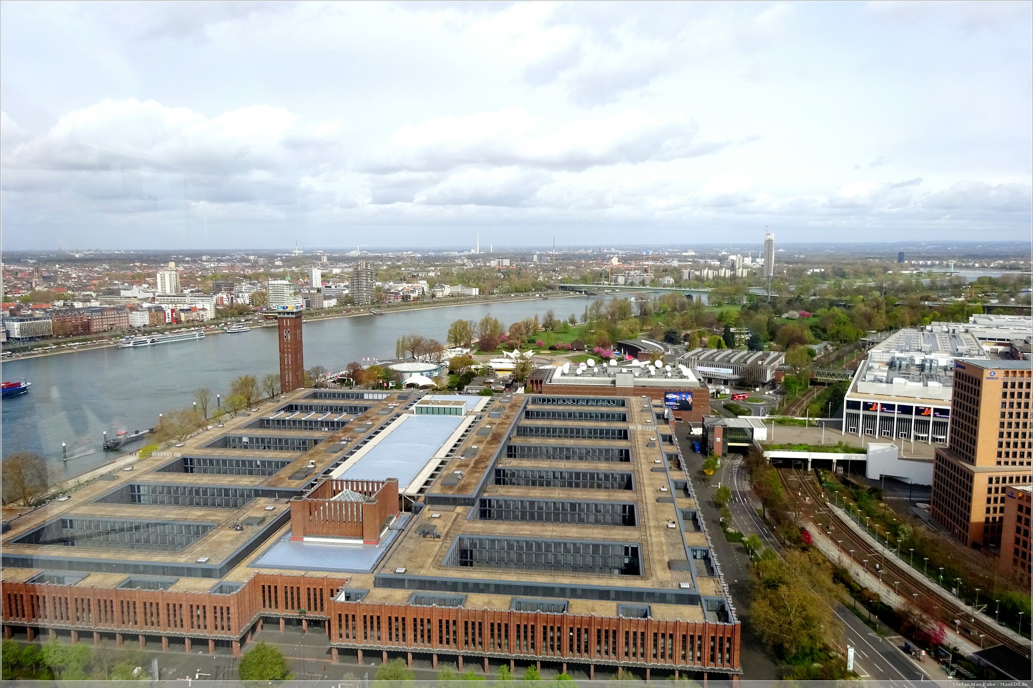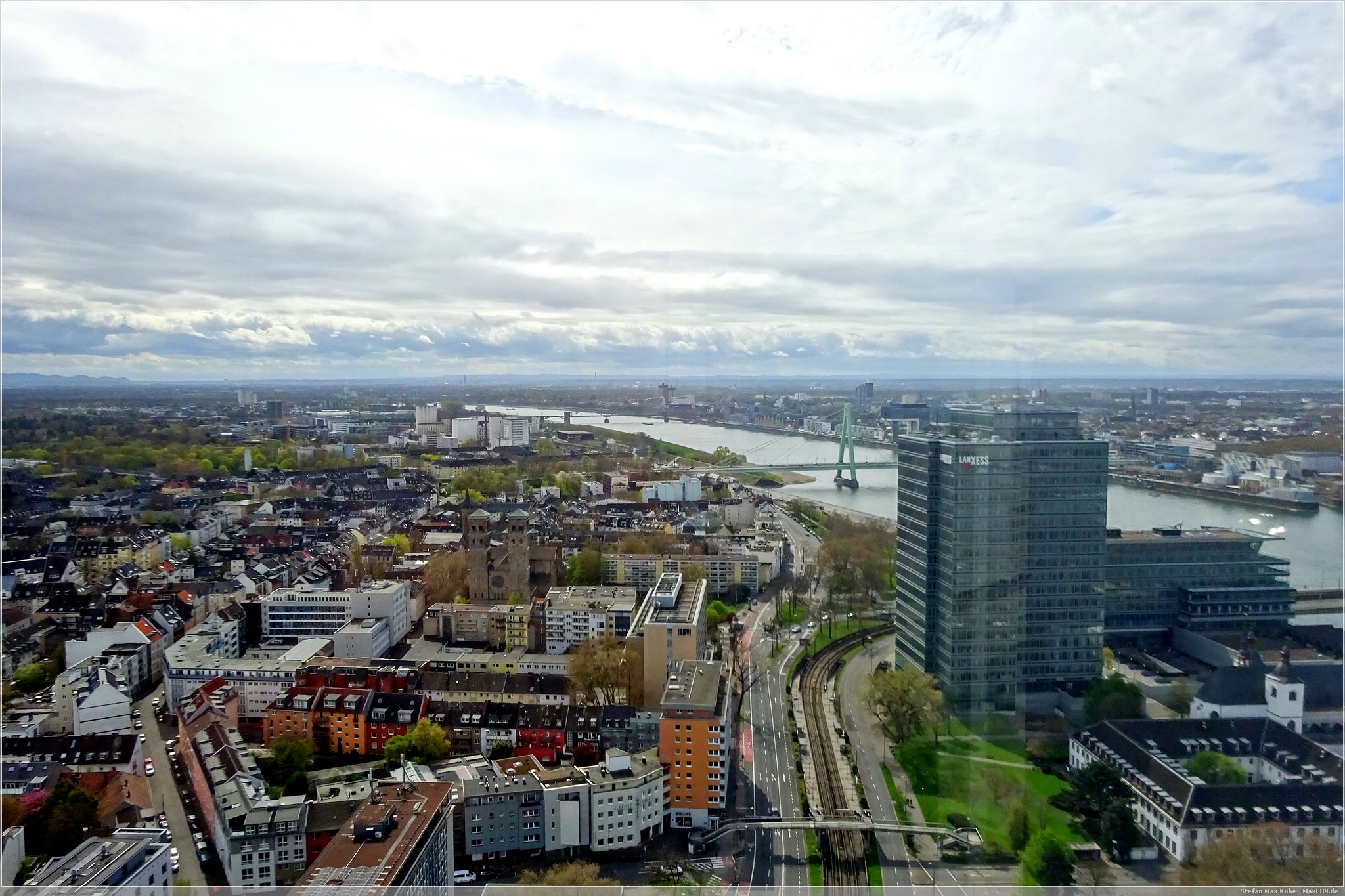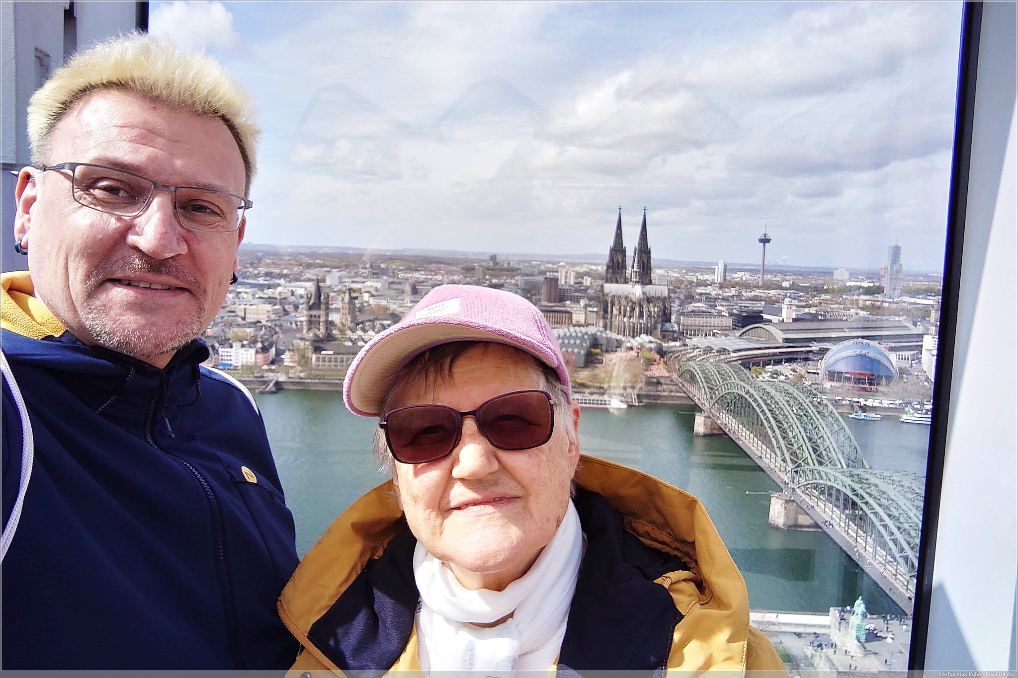 Das ist nicht einfach nur ein Büroturm, es bietet auf der Dachterrasse auf 103,2 m eine tolle Aussicht über Köln. So fuhren wir mit dem Aufzug in die 28. Etage und stiegen eine weitere Etage die Treppe hinauf. Mit uns kam auch gleich die Sonne heraus und so bot sich ein toller Blick über den Rhein, die Hohenzollernbrücke entlang auf den Dom.